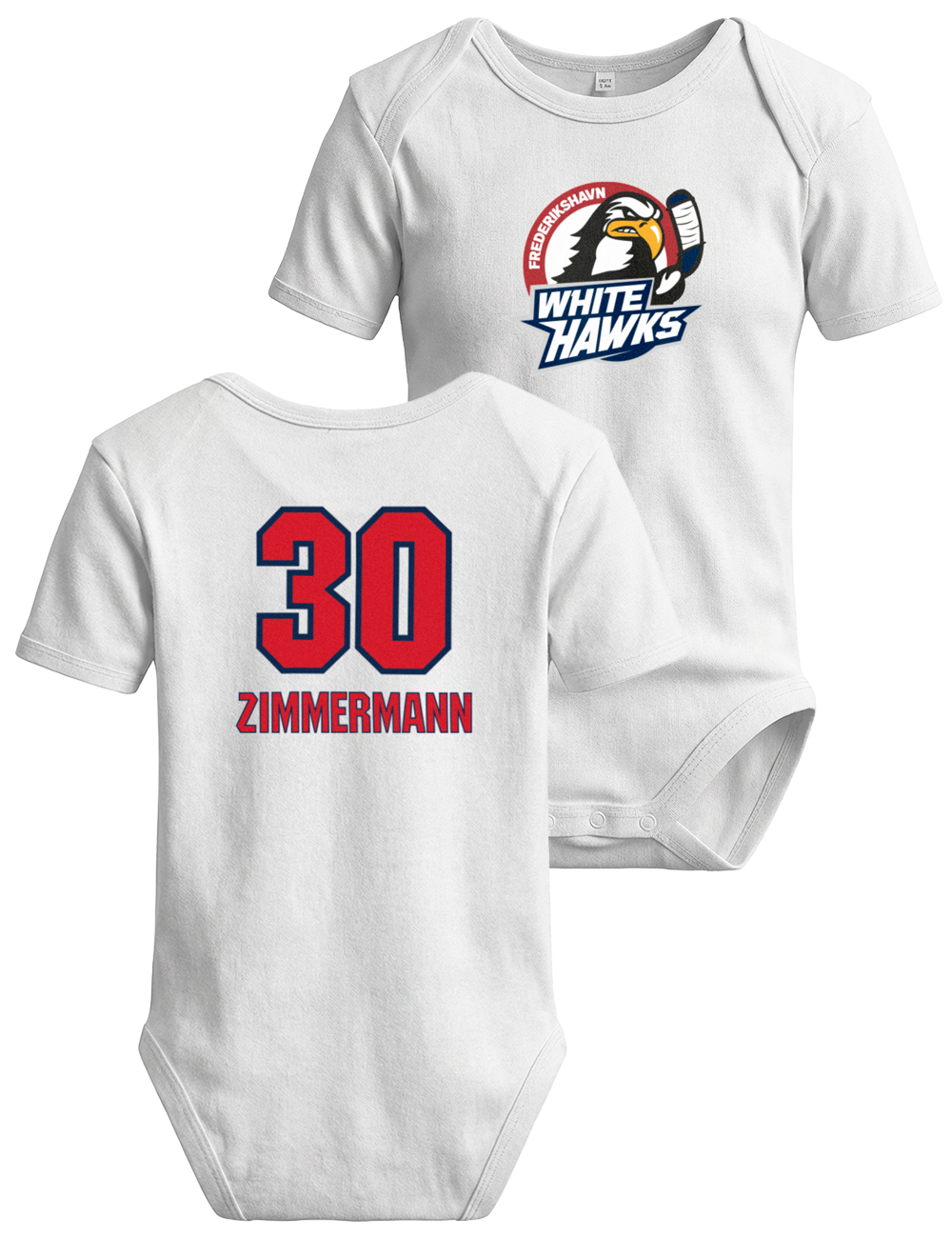 Lad familiens mindste White Hawks-fan være en del af holdet fra første dag. Denne søde baby body er dekoreret med det officielle Frederikshavn White Hawks-logo på fronten og kan personliggøres med eget navn og nummer på ryggen – ligesom en rigtig spillertrøje.
