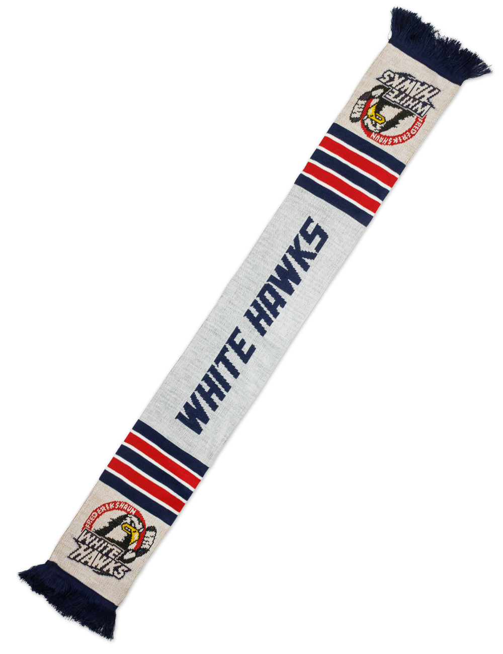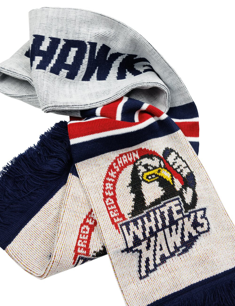 Dette halstørklæde er lavet i de klassiske White Hawks farver og logo. Brug den i de kolde måneder, eller når du skal ud og heppe på vores alle sammens hold.
