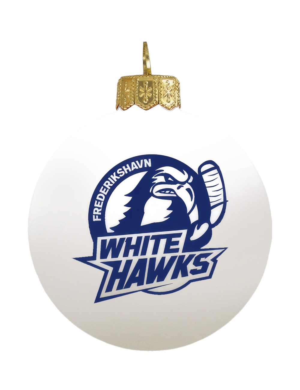 Pynt årets juletræ med vores flotte hvide julekugle med White Hawks logo.