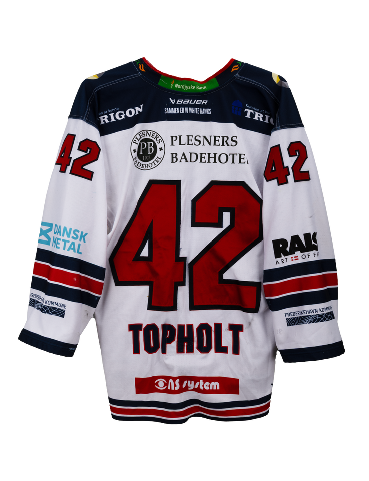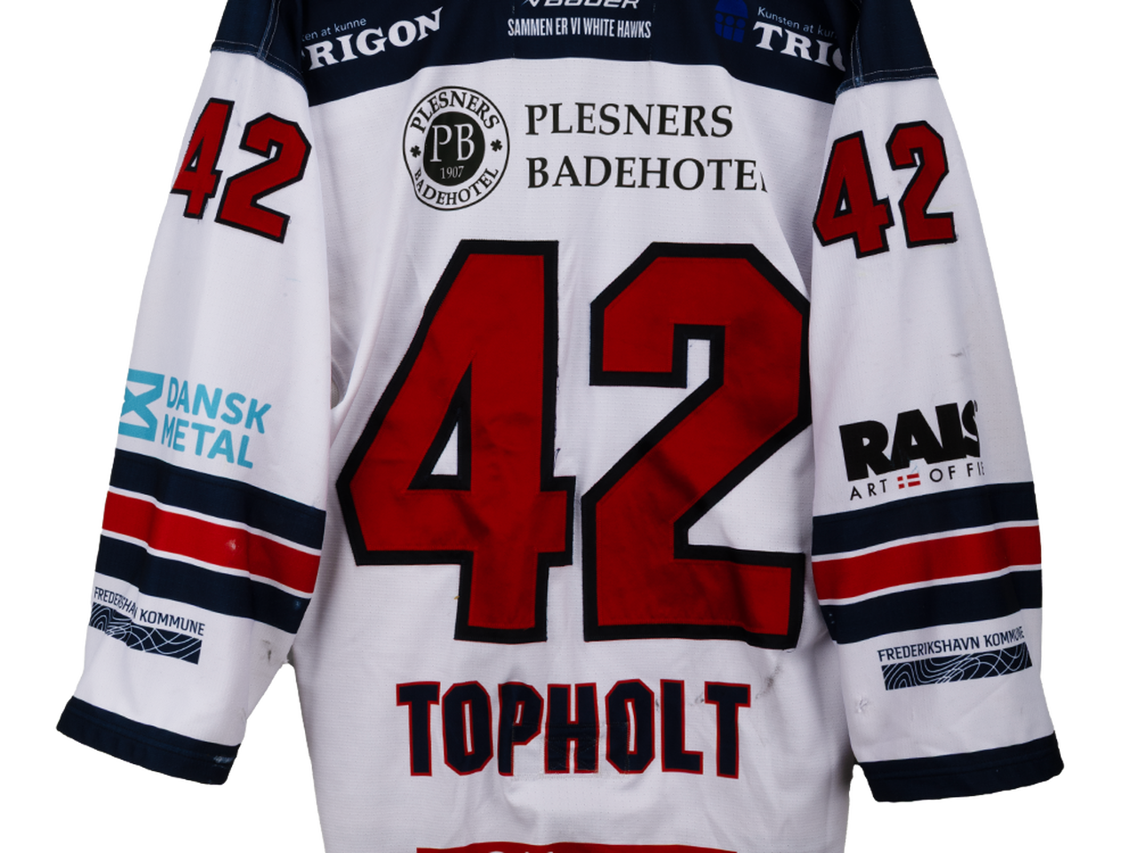 Her får du en unik mulighed for at sikre dig en ægte match worn trøje fra Topholt #42 fra Frederikshavn White Hawks.